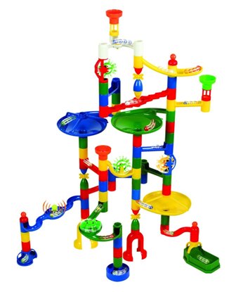 У нас есть подобный, но фирма другая, нет всяких завихрений. Это хит у нас уже давно. Собираю конечно я (я вообще люблю констуркторы, так что мне в кайф), а потом с дочкой запускаем шарики. У нас два набора по 50 примерно деталей, два выхода, поэтому соревнуемся с ней. А ваш на картинке вообще крутой.