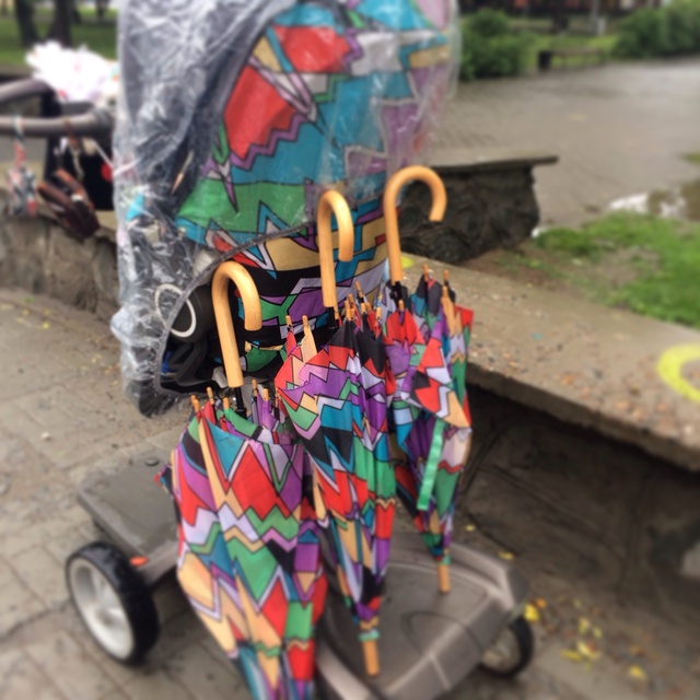 Были куплены зонты взрослый и детские, в одной разцветке (бывает в продаже). Ну и дождевик мамы (комплект к зонтам) пущен для перешива текстиля коляски, прошлое лето полностью носили (см под катом), нынче только детали: задник и бампер, переодевала.