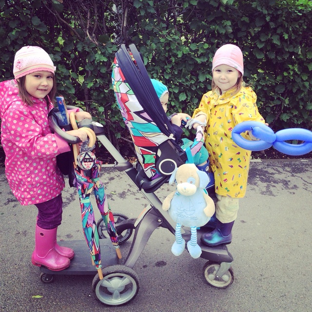 Чтобы не заморачиваться с зонтами - старшим детям (одному ребёнку) можно дождевички сшить, а на коляску - вместо силиконового сшить ветровик (см тут например на другой коляске). Который у стокке конечно супер, но на холоде задубеет. Респект зимнику =).