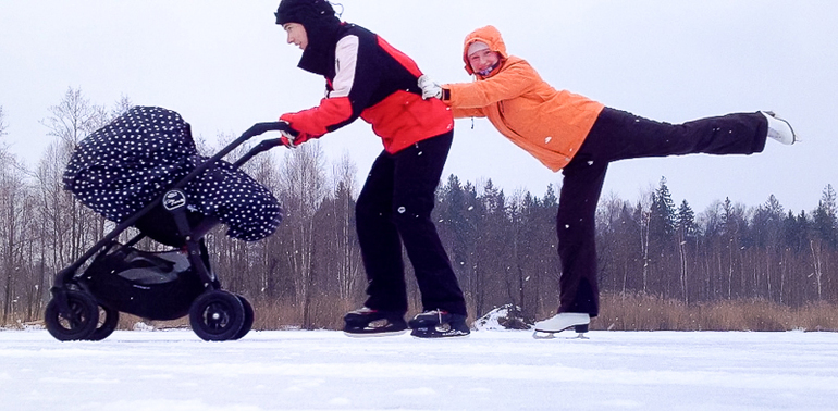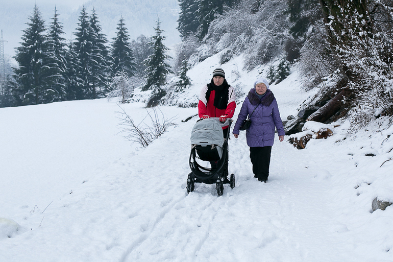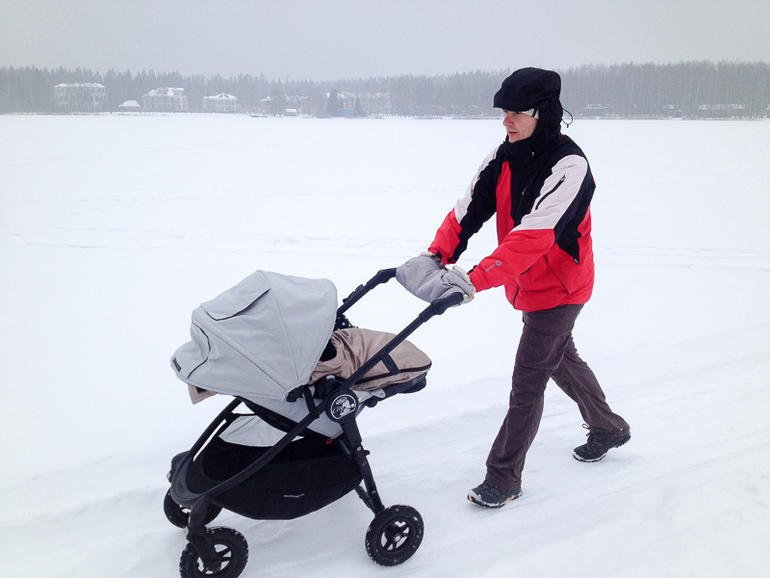 Долго выясняла разницу между City Versa и City Versa GT. Помимо разницы в цене (порядка 10 тысяч рублей), GT выпускается только в черном и красном цветах, а у обычной версы доступны также зеленый цвет и серебро. Но зато главное достоинство GT, за которое, видимо, и приходится так дорого платить - ее прекрасные неспускаемые резиновые колеса. Однако я выяснила, что эти колеса можно заказать отдельно, и по сумме выйдет все равно дешевле, чем брать сразу GT. В итоге решили заказать City Versa из Штатов на amazon.com, а на официальном сайте BabyJogger - комплект резиновых колес для зимы. Долго мучилась между черным цветом и серебром - в итоге заказала серебро, так как его в России официально не продают, а я жуть как люблю все особенное. Дальше была целая эпопея с доставкой коляски в Москву, так что мы уже отчаялись получить ее к поездке. Да и колеса заказать не получилось - начинался зимний сезон, и они банально закончились у производителя, а новая партия ожидалась не раньше февраля. Я очень боялась перспективы остаться вообще без детского транспорта и купила с рук практически новую черную Versa GT (ту, что на резиновых колесах). Девочка, которая ее продавала, живет за городом, и у них плохо чистят снег. Поэтому после первого же серьезного снегопада она выставила ее на продажу и взяла себе большой трехколесный вездеход.