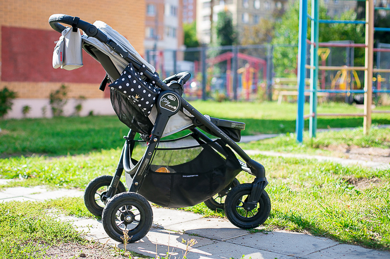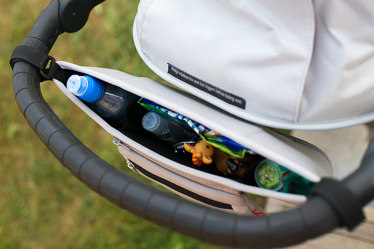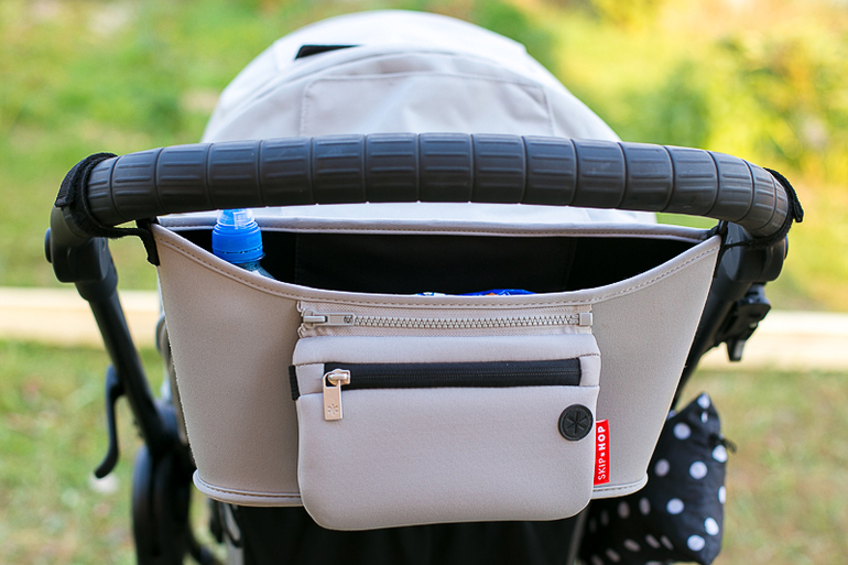Мне не нравилась перспектива лазить за салфетками и детской бутылочкой в сетку на спинке сиденья, поэтому на весну-лето-осень я купила органайзер Skip Hop серого цвета. Он замечательно подошел по цвету к коляске.