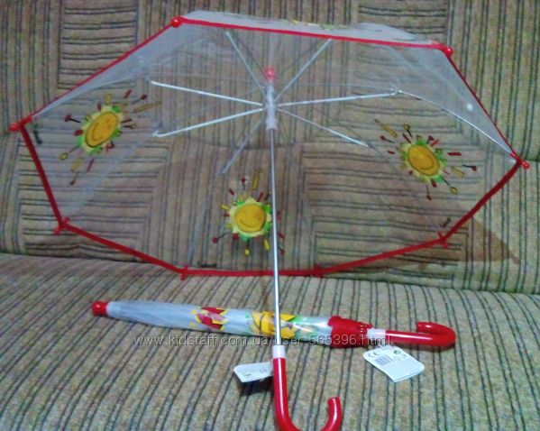 с ребёнком удобнее идти рядом, если зонт грибочком, ну и прозрачный — чтобы видеть что впереди