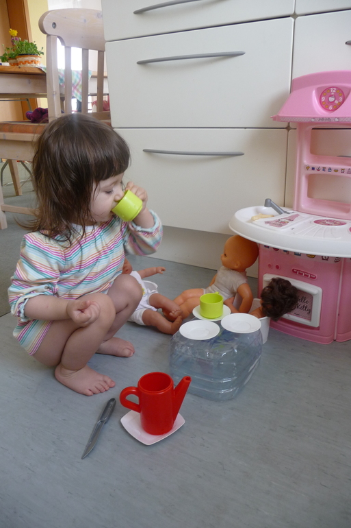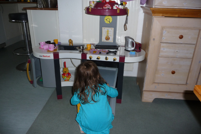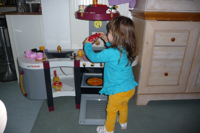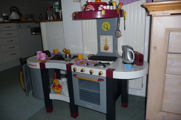 Прямо скажу, что реальность немного дороговата, поэтому стала смотреть на ebay и ebay kleinanzeigen объявления о прадаже. И всё-таки нашла недалеко от нас такую кухню. Фотоаппарат с собой не брала, поэтому не могу показать как нам пришлось её транспортировать, т.к. машина у нас очень маленькая, но всё же довезли, собрали то, что пришлось разобрать и понеслась у нас игра. Играть доча начала уже у машины, пока мы пытались впихнуть эту кухню внутрь, но дома уже было всё по настоящему: кормила кукол, что-то резала, готовила, зажигала конфорки, мыла посуду в раковине с водой ( а мама в это время вытирала лужи под мойкой), выпекала пицу, а потом кормила её маму и папу.