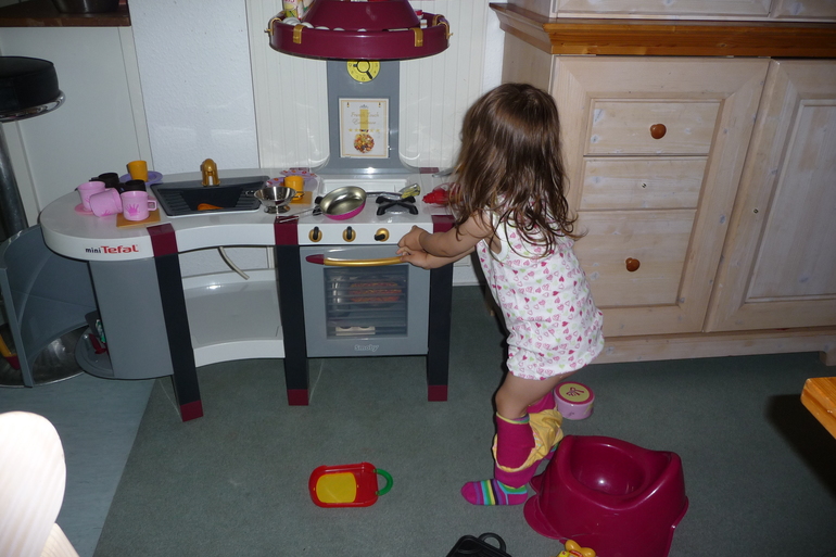 Играла так отчаянно, что сняв штаны и трусы, попросила принести горшок (обычно это всё она делает сама), чтобы не отвлекаться. Потом продолжала играть на горшке, а далее со спущенными штанами))))