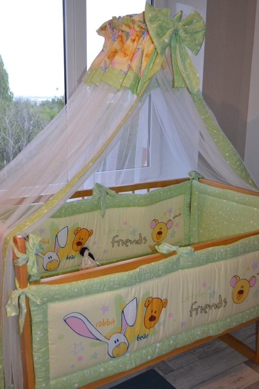 Детская комната : мебель, постельное белье, предметы интерьера и аксессуарыНе удержалась и всё-таки нарядила кроватку бортиками и балдахином из комплекта "Дрема". С самого начала беременности хотела именно этот салатовый комплект. И чем чаще смотрела на другие, тем больше убеждалась в правильности своего выбора.