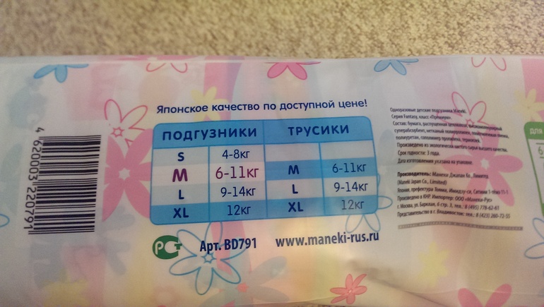 А нам очень понравились такие подгузники, по лучше чем Меррис и Гуны, от которых у ребенка пошла дикая аллергия. Купили Манеки-забыли все беды с аллергией, протеканиями по ночам. Очень хорошо сделали и поясок, который очень мягкий и не давит малышу. Не маломерит. Размеры соответствуют заявленным на упаковке. От себя рекомендую брать Манеки.