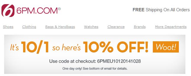 ass valid on the 6pm website until 11:59pm PDT on 10/1/14 or until 40,000 shoppers have used the code. Cannot be combined with other offers or applied to previous purchases. Discount is applied before taxes and shipping, if applicable.