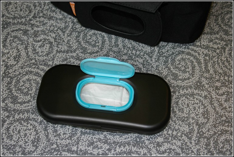 В пришитом кармашке удобно расположился многоразовый контейнер с влажными салфетками, которые так необходимы с малышами. Его местоположение позволяет легко и одной рукой достать салфетку, не ковыряясь в сумке среди вещей.