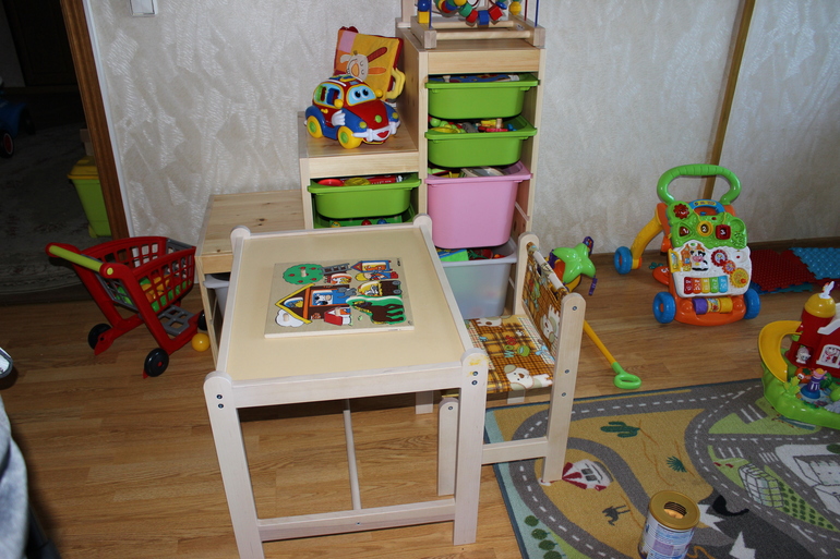 Кстати, по цвету стеллаж прекрасно подошел к Костиному столику и стульчику для занятий. На бардак внимания не обращаем, все снималось в процессе игры)