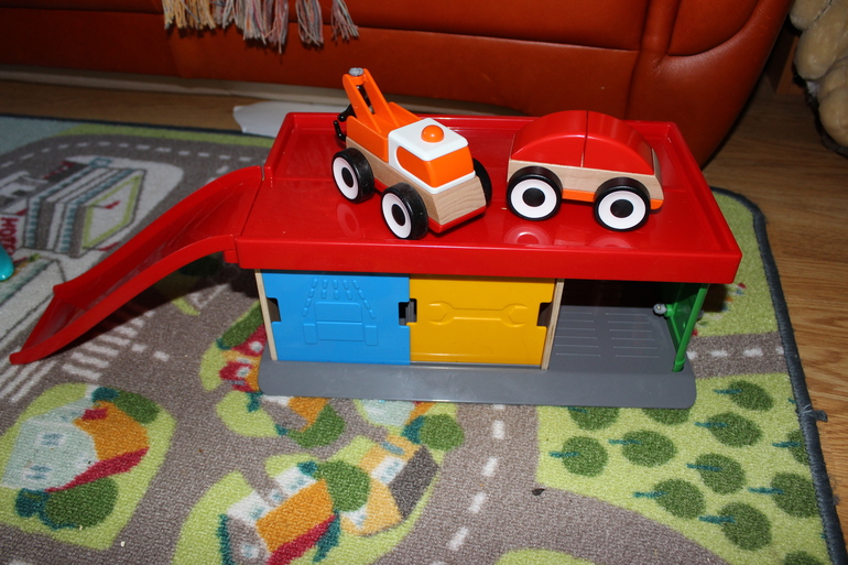 Ну, и естественно, без игрушек не обошлось. Гараж с эвакуатором) сын без ума от него! И еще одну машинку купила в дополнение. Машинки с деревянной основой, катаются плавно и легко. Все довольны)