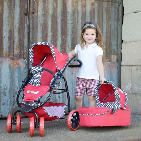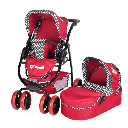 коляска 2в1, габариты 55*43*82, регулировка ручки по высоте от 43 до 82, поворотные колеса. Не очень нравится, что колеса сдвоенные, смотрится громоздко. И еще думаю, что дочка замучает меня переставлять блоки туда-обратно или сама будет это постоянно делать и сломает крепежи, а они, судя по фото, пластмассовые.