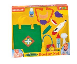 Набор доктора со звуковыми эффектами, kiddieland. - Купила с сумкой. Набор суперский! Шприц пищит, тонометр - качаешь, крутиться, стетоскоп кашляет и стук сердца издает, у градусника кнопкой меняется температура. Сумка не плохая, но на авоську смахивает. Я надбор усовершенствовала сама. В ашане купила пластиковую аптечку, туда все сложила. Взяла еще один набор дешевый, оттуда мне пригодились - очки, печать, блистер с таблектками и капсулами, колбочки для крови с подставкой. А еще сама сшила белый халатик, с красным крестом на кармашке! Уже играем - из подарков выпадает!