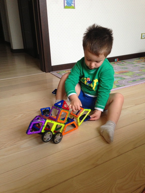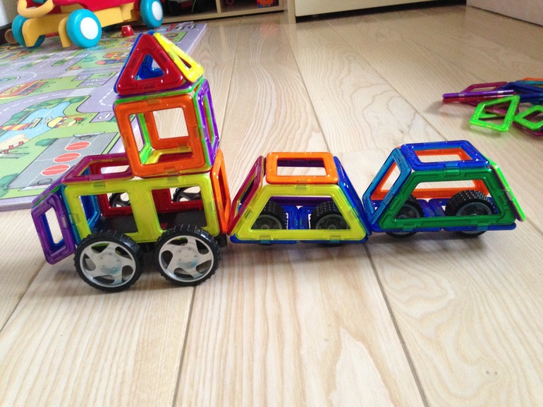 Выбор подарка ребенкуСегодня получила очередной заказ из magformers.ru и спешу поделиться со всеми желающими скидкой 5%, которая будет действовать целый месяц, до 21.11.2014!Мой сын, которому уже 2,9, в последнее время открыл для себя заново этот замечательный конструктор. Если раньше в основном я сама собирала машинки и домики, а он с огромной скоростью разбирал обратно, то теперь он сам доста коробку, раскладывает детальки и я его не вижу и не слышу минут сорок! Нам стало явно мало квадратов и треугольников, с которых (плюс набор колес) мы начали знакомство с Magformers. В этот раз я прикупила ромбы и трапеции, получив в подарок пару шести угольников. Надо ли говорить, что после дневного сна и до 10 вечера ребенок был занят хорошим делом - он творил. Что уж там, и мы с мужем не устояли, поиграли для души. Бабушка наша все переживает, что мы сына балуем. Купила ему грузовичок, дешевый, так он в тот же день разваалился. В общем, в очередной раз убедилась - лучше купить качественную дорогую вещь раз в полгода, чем всякую дрянь раз в неделю. Кстати, моя 10-месячная дочь тоже любит magformers. Грызет его нещадно, а ему хоть бы что!