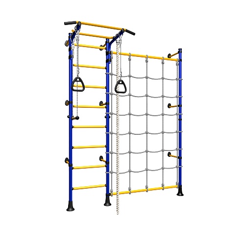 У нас весёлый непоседа. Крепление враспор. Перекладины с покрытием. И сетка есть. Очень хороший комплекс