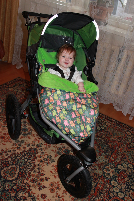 Плащевка точно такая же, а флис темно зеленый, но у меня еще нет зимней коляски на который буду его использовать. Так что теперь цвет коляски придется под конверт подбирать, хотелось какой нибудь более универсального цвета конверт, но очень коты понравились))) А у вас по цвету все классно совпадает!
