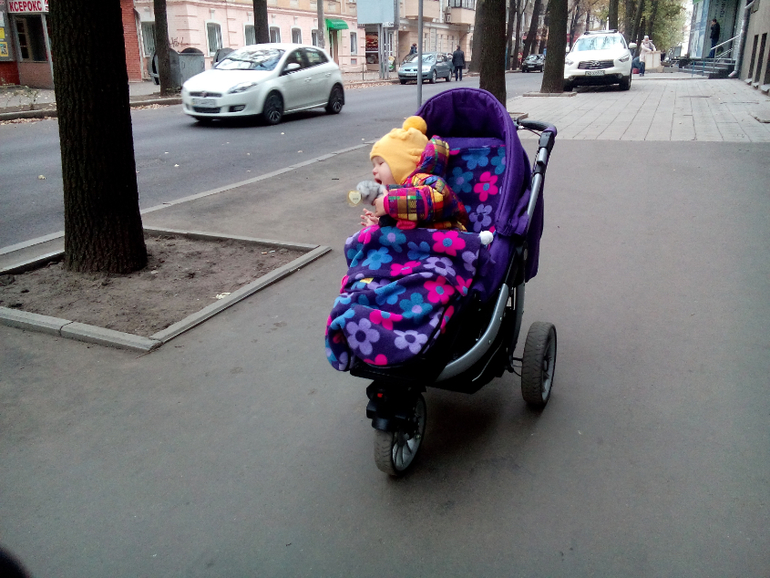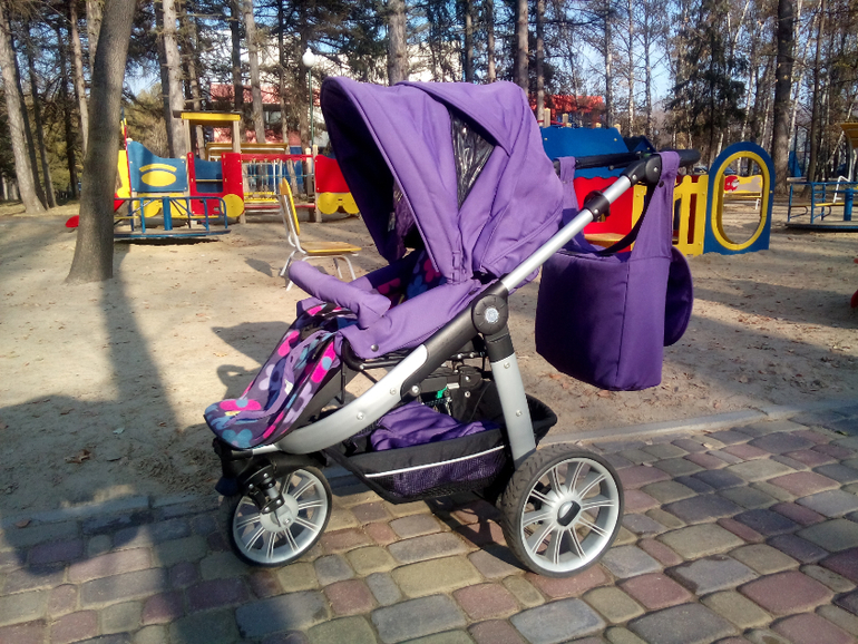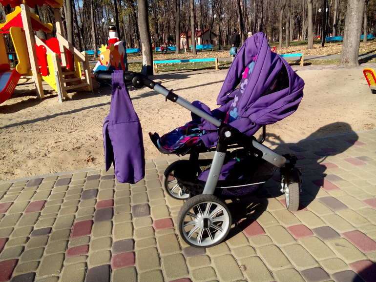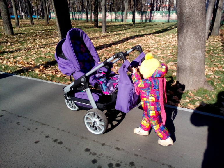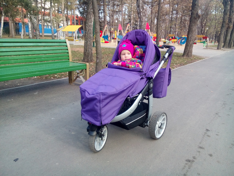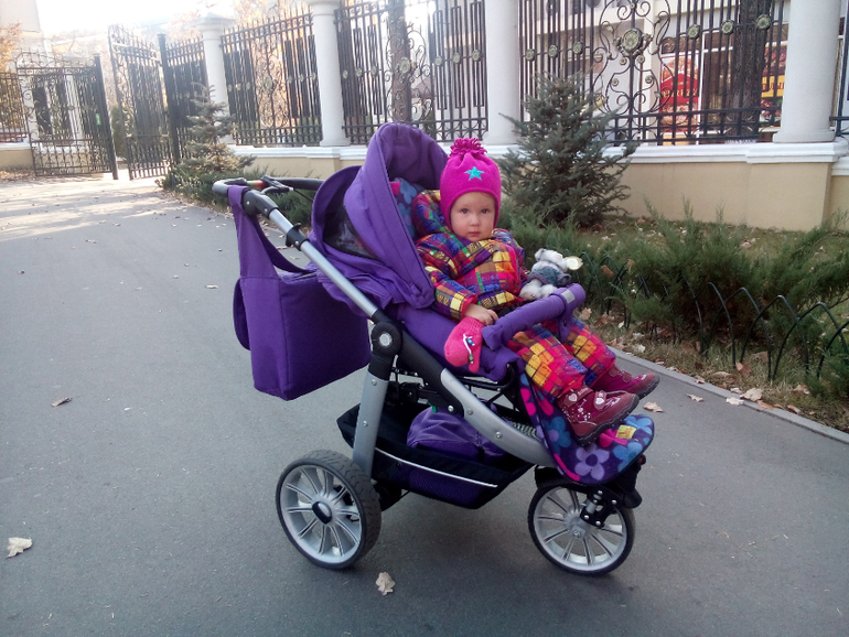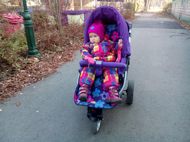 Поехали смотреть красотку , примерила я в нее дочку в комбезе и показалась мне сидуха узкой , мелкой , кап на голове , сама коляска какой-то шаткой- валкой и тяжелой . Это теперь понимаю , что все эти ощущения были после дубовой широкой миньки , в которой моя стройная ( 10 кг в почти полтора года) дочка болтается. Короче , мы тогда уехали не забрав немку еще и по причине отсутствия ее документов , которые находились на другой квартире, а фрау еще на гарантии ( у тевтонии она 3 года !). Договорились забрать ее уже с документами. А у меня сомнения ,опять бессонные ночи, тк на следующий день встретиться с хозяивами не удалось. Тевтония мне в душу запала своим качеством , добротностью , основательностью , а еще цветом. Потрясающий темно - сиреневый цвет , я вообще фанат сиреневого и фиолетового , у меня и минька пурпурная. И я все думала, что нужно еще раз примерить в нее дочку, чтобы уже наверняка определиться. И тут мне позвонила мамочка , продававшая коляску, и сказала , что они сами мне ее привезут уже с бумагами . И я решила , пусть везут, возьму, не понравится - продам. Привезли , еще раз все показали и мне она уже не показалась такой большой и неповоротливой, как при первой встрече, дочка принялась катать сама ее по квартире , это единственная наша коляска в которой ручку можно опустить так низко ( теперь катает на каждой прогулке - нравится !). А потом я Евгешу в коляску усадила без комбеза, в колготках, и оказалось , что занимает она от силы 2/ 3 сидушки и высота капа не критична, он сложенный не лежит складками за головой, а весь сзади спинки и в разложенном положении еще есть до него запас , на эту зиму точно хватит. Лежа дочка полностью помещается при поднятой подножке и опущенной спинке. Вышли гулять. Коляска не едет , а плывет , уверенно так , мягко сглаживая все препятствия . Можно просто идти прямо , а не выписывать кренделя , как с бугабу и там , где минька подпрыгивает или колесо переднее встает раком , уверенно мягко проходит , не замечая преград. Смазала колеса силиконом , еще легче пошла. Конечно коляска не из легких, от силы мысли не едет , но она же внедорожник ! То , что это трешка, почти не ощущается , ооочень устойчивая ! Дочка за борт перевешивалась, сама залазила- слезала, тоша не шелохнулась ! А еще приятным бонусом для нас с дочкой стало возможное положение лицом к маме, давно мы так не катались ! А оказалось, что нам это на данный момент актуально , ехали , общались , дочка дольше обычного в коляске высидела . Очень нравятся кожанные накладки на ручку и ручной тормоз , стильно и удобно . Вообще очень нравится дизайн , наша коляска с капом мейд фо ю , он сзади к спинке крепится и " фартук" не болтается , вот не люблю я это в колясках, в бритаксе меня это смущало. Отличная комплектация в отличие от соратников по цене ( имею ввиду новые коляски ) , у нас только прогулка , к ней бампер , накидка на ножки ( как мне этой опции не хватает у других моих колясок !), сумка с косметичкой и огромным количеством отделений и кармашков, пеленальный коврик , дождевик и москитка в отдельных сумочках, чехол- термос для бутылочки . В капе силиконовое окошко и можно отстегнуть целую секцию , а под ней москитка ( зимой не актуально). Переднее колесо фиксируется рычажком над креплением колеса - руки чистые, но коляска и так устойчиво держит курс даже по выбоинам , специально проверяла. Как я проч
