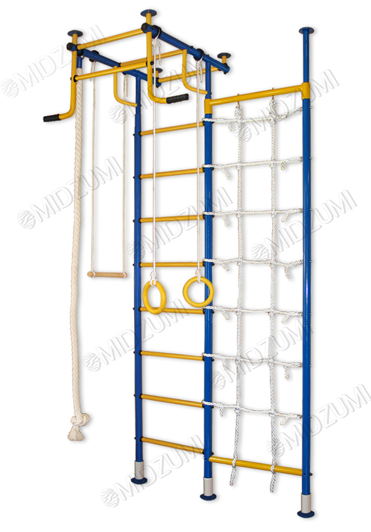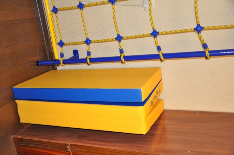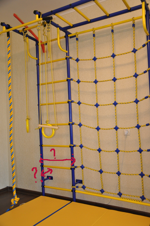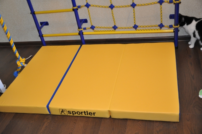 Мат прикольный - складывается втрое и убирается в уголок (фотка перевернута). Кстати, комплекс крепится к стене. У нас натяжные потолки и крепление враспор стена-потолок для нас не подходит. Заказывали