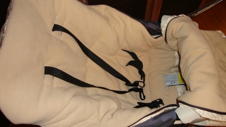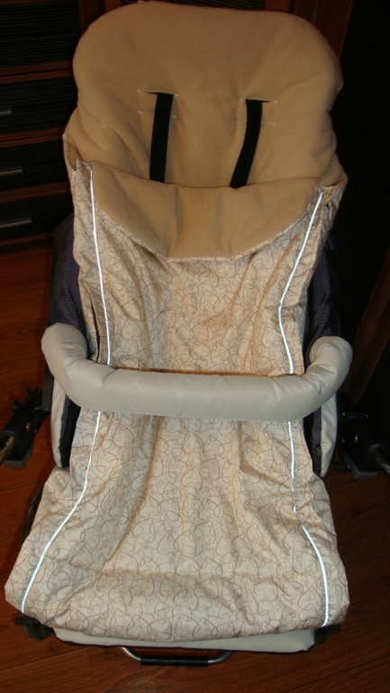 Вот так выглядит изделие уже на коляске, ремни вставлены, что дополнительно удерживает конверт и не дает ему сползать вниз.