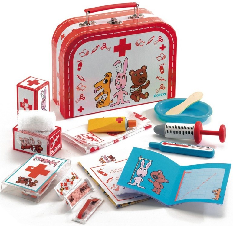 Battat.в djeco очень мало инструментов ,слишком много каких то бумажек и тд ,что реьенок быстро порвет..плюс коробка бумажная,мой сын подобную этой фирмы быстро "убил",стоило один раз присесть на нее,наступить...она как бы цела,но подтрёпана ..при том ,что у меня реьенок впринципе аккуратный ,ничего особо не ломает..и джеко я уважаю за качество,игр у нас много,но набор доктора вообще своих денеги не стоит