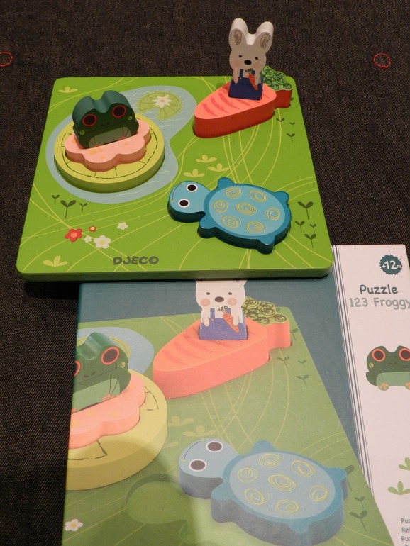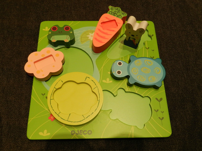Я в эту штуку просто влюблена! Черепаха, как видите, сама по себе. Заяц на морковке - это уже "двуслойный" пазл, а лягушка на кувшинке - и вовсе три слоя! При этом немаловажно, что перевёрнутые вверх ногами (вниз рисунком) детали не вставить! Боковая поверхность фигурок спилена, видимо, под углом. При этом все детали "стоят" самостоятельно, ими можно играть.