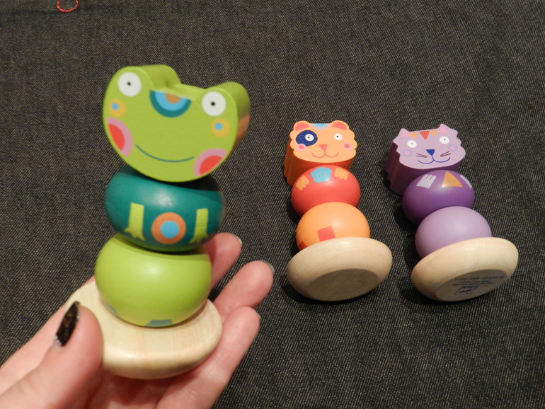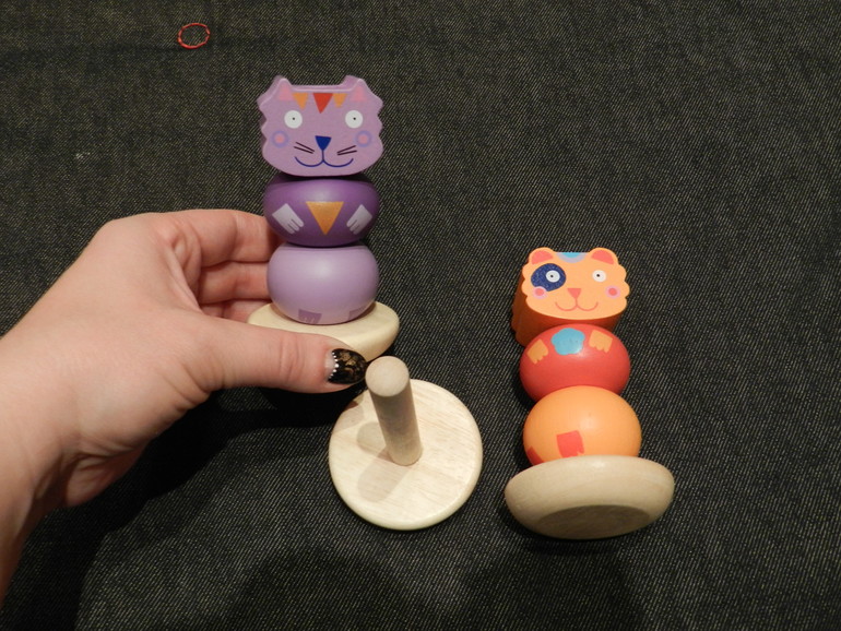 Это совсем простецкие пирамидки, которые ребёнок в силах нанизать уже в годик. Но нанизать в нужном порядке, не перепутав верх и них каждого звена - эта задача уже где-то для полуторагодовалого. В общем, мой сын в год и пять месяцев сразу понял, конечно же, что тут к чему, но направление рисунка лапок-ножек-ручек пока не учитывает.