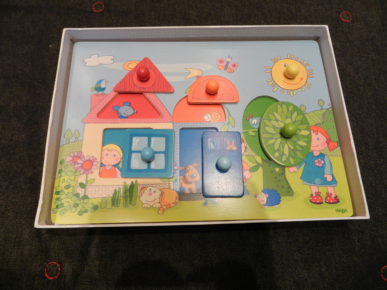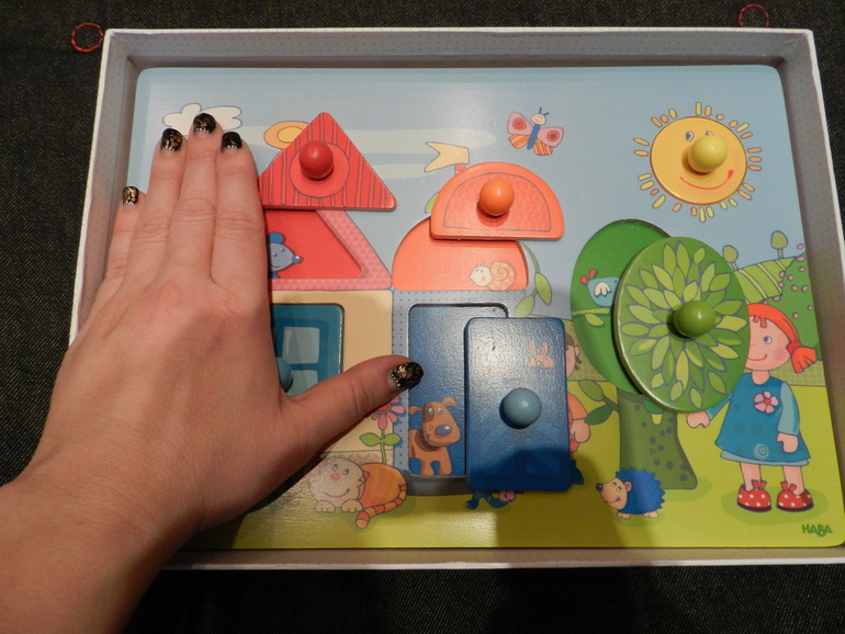 А вот игрушка с окошками Haba. Не знаю, зачем они маркируют возраст как 1,5+ Павлуша разобрался с ним сразу. Приносит мне, чтобы открыть окошки и назвать животных. Закрывает окошки - и всё, игра закончена. Штука хорошая, но рассчитана на годовалых деток