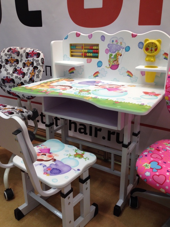 Вот такие розовые и голубые есть. Голубой не сфотографировала, что- то не подумала, что может пригодится. Только сейчас увидела, что розовый стульчик собрали неправильно, сидушку перевернули))) Размеры.Стол: 69х45 высота 85(88,91). Стул: 34х38, высота 66(69,72) см. Столешница МДФ.