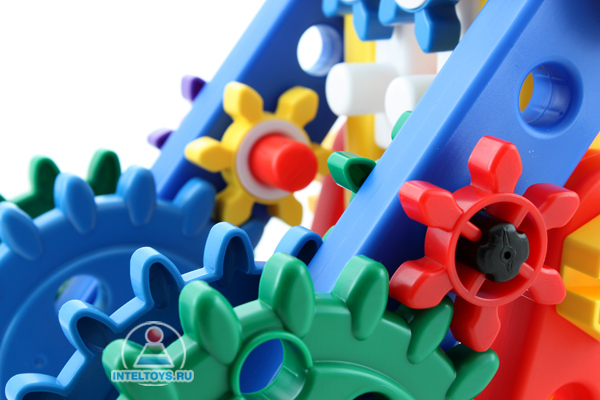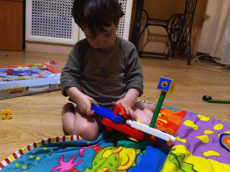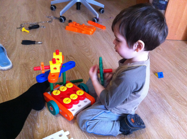 Деталюшки такие клевенькие - гладенькие, все скругленные, приятных цветов. Соединяются с усилием вполне доступным малышу, не совсем легко - пальчики разминаются, развиваются, но и вполне успешно в результате ребенок справляется. Плюс - цвета учим, когда я прошу его подать вон ту красную палочку, или зеленое колесико, или синюю эээ...деталь ))