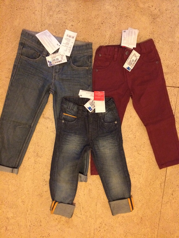 Три пары джинсиков. 150, 100 и 250 рублей. По-моему, неплохо.