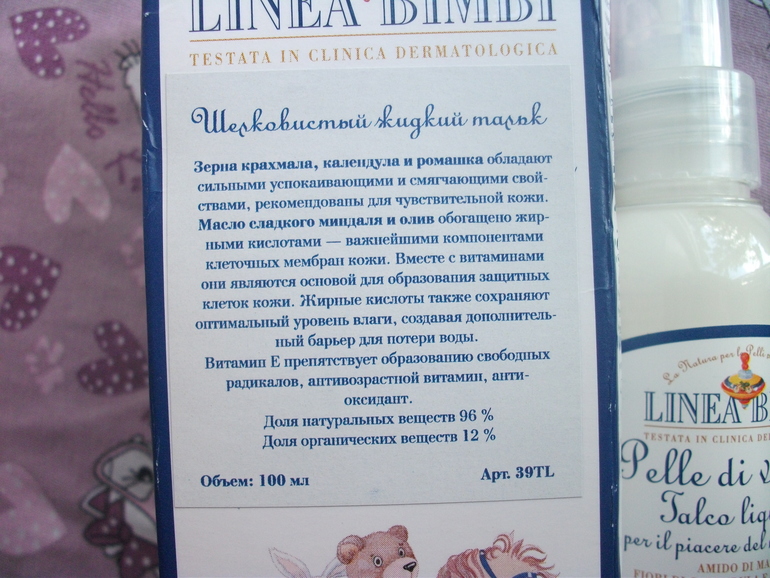 Косметика и гигиена.Ванночки и горшки, шампуни, средства для стирки и мытья, личная гигиенХочу поделиться своей покупкой жидкого талька для тела, из серии органики для детей Linea Bimbi фирма Helan.