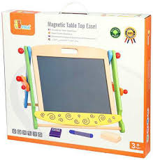 У нас аналогичный, марка Lelin. Он небольшой, хорошо держит магниты (или это от магнитов зависит?). Рисовать пока не пробовали на нем. Нам не повезло, он к нам приехал в мятой коробке, с незначительными повреждениями. Краска кое-где обтерта, есть две вмятины в дереве. Китай, одним словом. Не стала заморачиваться, оставила, теперь жалею. Мольберт хороший, но впечатление подпорчено. Я долго искала именно настольный, ничего подходящего кроме этого не нашла — все остальное либо напольные либо настенные. Есть еще немецкий Hape, но я его нашла случайно уже после покупки этого.