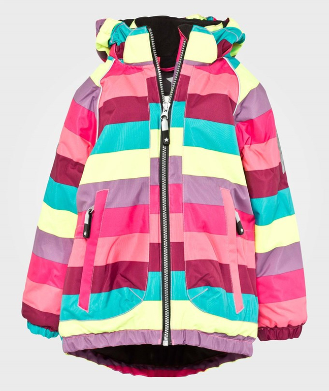 Вообще, вся линейка Molo большемерит, курточки у нас не было, но был слитник, напишу свои личные впечатления. Не такой он уж теплый, маленькая горловина, флис только по спине и висел на попе, чтобы надеть капюшон надо отстегнуть воротник ( из кармашков), просто так он не налезает. А из плюсов, конечно это их расцветки, не оставят не замеченным в толпе