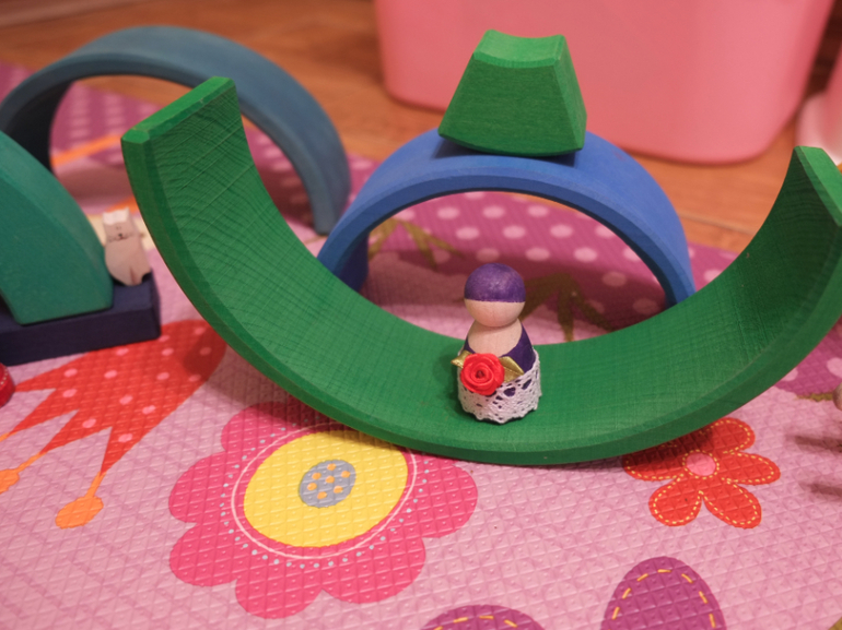 С фигурками я уверена, что будет играть. Единственно — она в детство впадает)) Все в рот тянет((( С радугой играет, но не очень активно. Иногда пробует залезть под нее (когда она в виде тоннеля сделана или самой сделать такой тоннель). Иногда просто расставляет, или типа "забор" делает. Я пытаюсь ее "присоединить" к романскому, но тут вот какая сложность: романский в корзине и он и так тяжелый. Радугу туда не подложишь. Потому они раздельно лежат. Игры у нас в основном на кухне, но вечером стараюсь все убрать, то есть не могу держать тут радугу к примеру. Или заставлять принести все сразу: и конструктор, и радугу, а потом еще домики будут)))