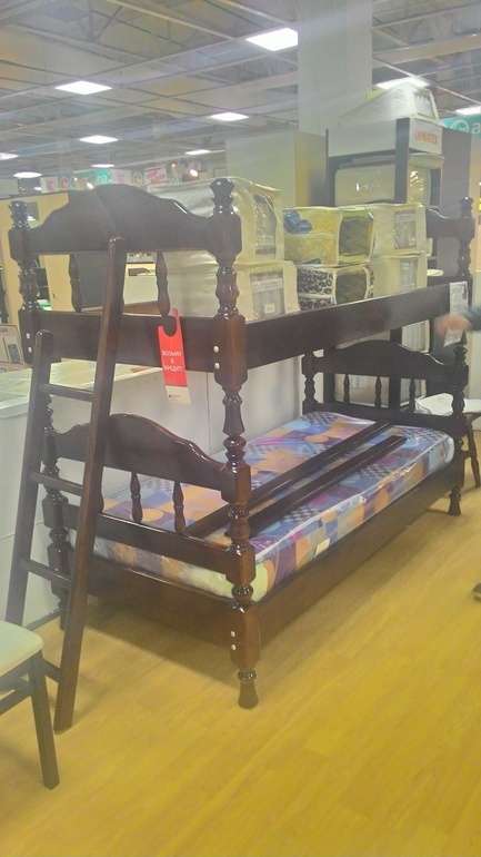 Выбираем "взрослую". Кричит что хочет только 2-х ярусную и никакую больше, т.е. спать наверху. Из фанеры с ящиками снизу и прочим я точно не хочу. И главный критерий, чтобы верх был не слишком высоким. Нашли парочку, где верхний ярус на уровне моей груди, высота нормальная.