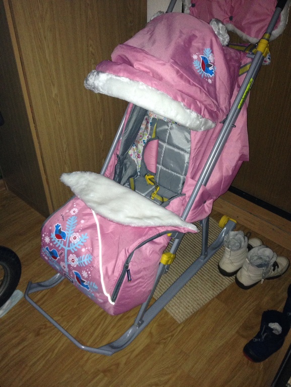 В этом году еще рано, ждем снегопадов. В декабре достану со шкафа. Пока на коляске покатаемся.