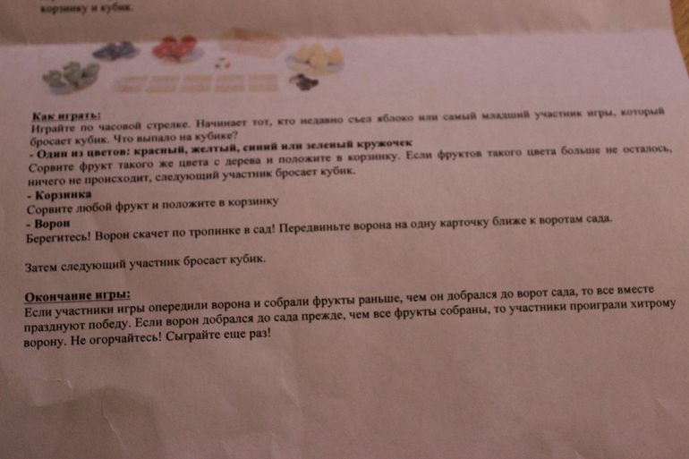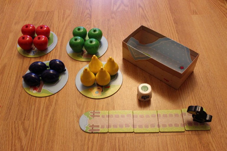 Итак, что внутри: 4 красных яблока, 4 зеленых яблока, 4 желтых груши, 4 синих сливы, 1 ворон, 1 игральный кубик, 4 поля с деревьями, картонное лукошко, тропинка и инструкция.