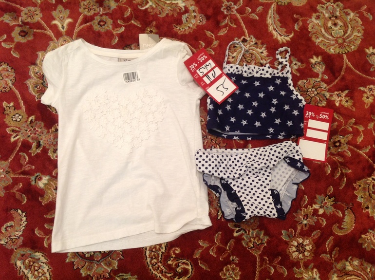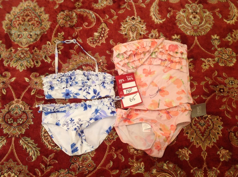 Через пару месяцев начнется купальный сезон, поэтому конечно купальники дочке. 495 с футболкой и 585 нижние.