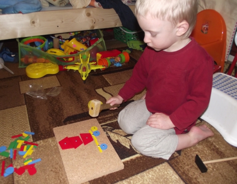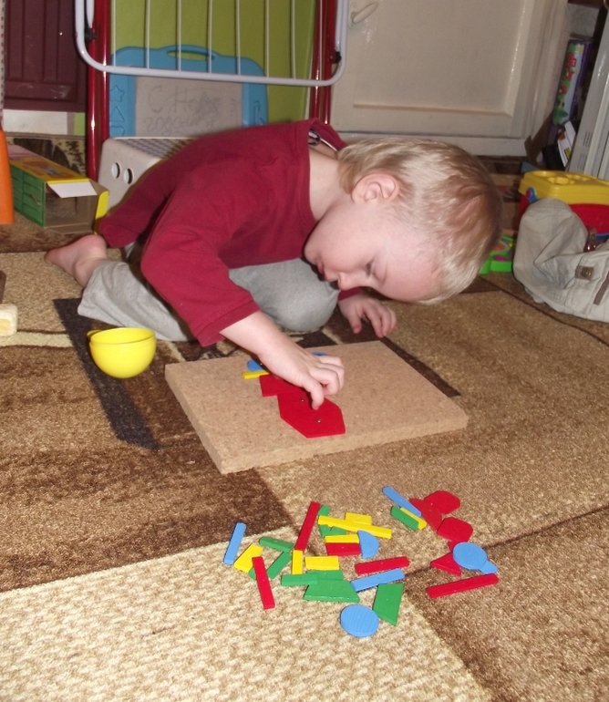 5. Также заказала игру-мозаику тут , которая мне уже давно приглянулась. Это пробковая доска, на которую нужно маленькими гвоздиками прибивать деревянные детали, составлять рисунок. Производство Германия. Задумка очень классная! Да и качество хорошее. А вот сами детали - не продуманы. Гвоздики очень уж маленькие - маленькими пальчиками ухватить сложновато, а тем более - вставить в дырочку так, чтобы не выпадал... Молоточек тоже малюсенький (мы стали использовать свой из другой игры). Формы деталек очень уж нестандартные, что не дает развернуться, придумать изображения. Может, конечно, это у меня с фантазией туго, но я никак не могу предложить ребенку сделать что-то простое, но в то же время интересное для него. На коробке приведено несколько примеров: стол и стул, цветочек, человечек, тележка... Моему ребенку эти изображения неинтерсны. Один раз мы сделали танк, другой - ракету... больше чет я не знаю, что придумать))). Думаю, попросить мужа повыпиливать из фанерки более простых деталей.