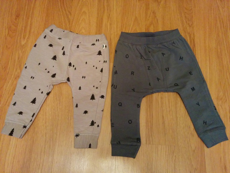 Начну с того, что не понравилось. Эти модели на фото ниже. Штаны с елками сделаны в Португалии, штаны с непонятным рисунком в Пакистане. Какие же они разные по качеству! Ткань на штанах с елками очень грубая, как наждачка. Катышки появились ещё когда она ехала ко мне, так что после первой стирки я думаю их можно выкидывать. А лучше сразу сдать обратно в магазин :) Внутри они с начесом. Те, что из Пакистана, мягкие, но при этом огромные в талии и бедрах. Утяжек нет. С моего старшего они слетели, хотя для чистоты эксперимента я даже надела на него памперс. Не думаю, что малыши настолько толще моего 2,5 летнего сына)) Тоже отказ.
