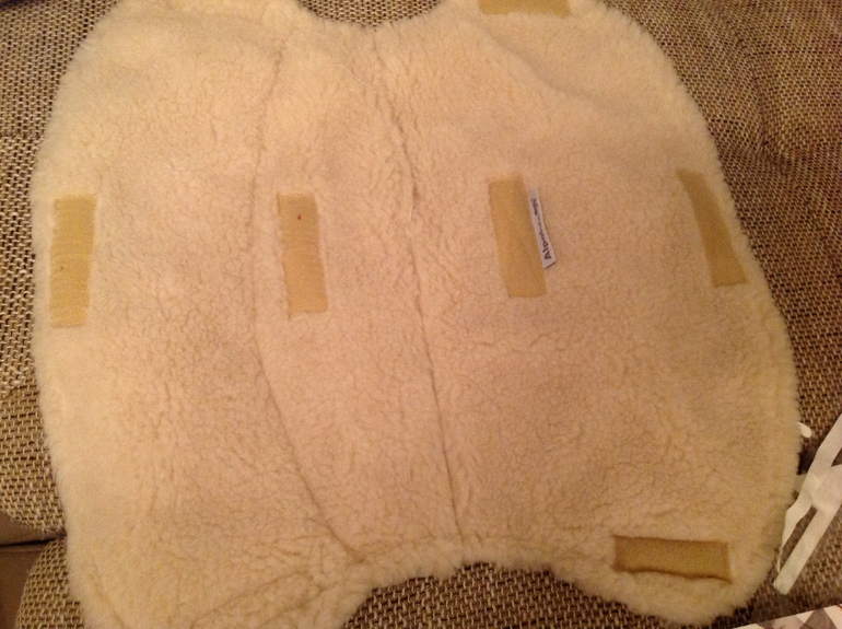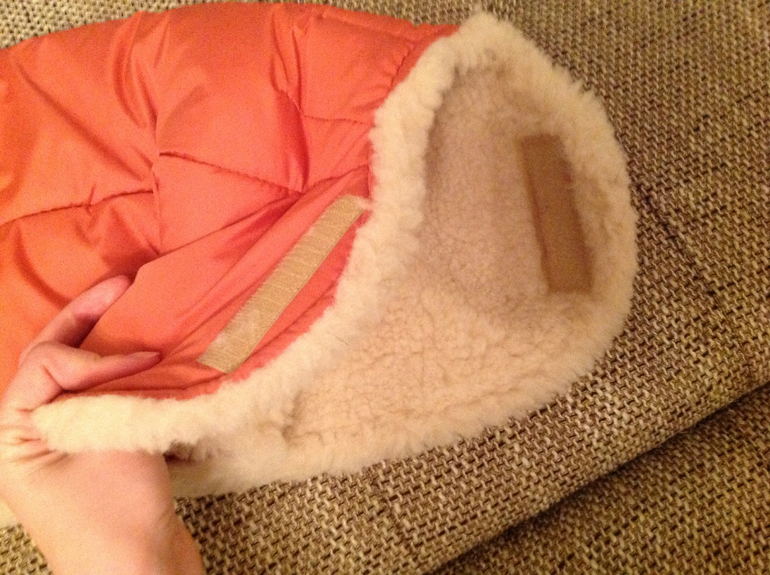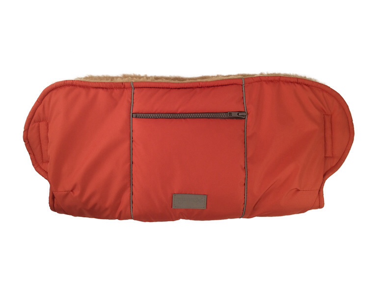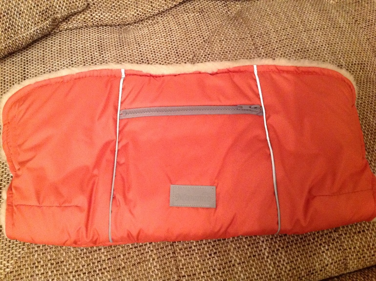 Внутри мягка и теплющая .Муфта на липучках,пристегивать на ручку коляски очень просто,даже с ребенком на руках
