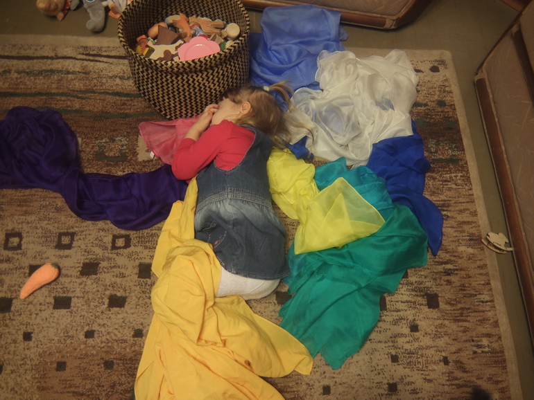 Дочка любит играть тряпочками (наряжается, танцует с ними, укутывает кукол, расстилает на полу, сидит на них), до этого у нас было много синтетических платков. Сейчас я все их заменила на натуральные. В качестве подарка от прабабушки заказала несколько отрезов игрового шелка.