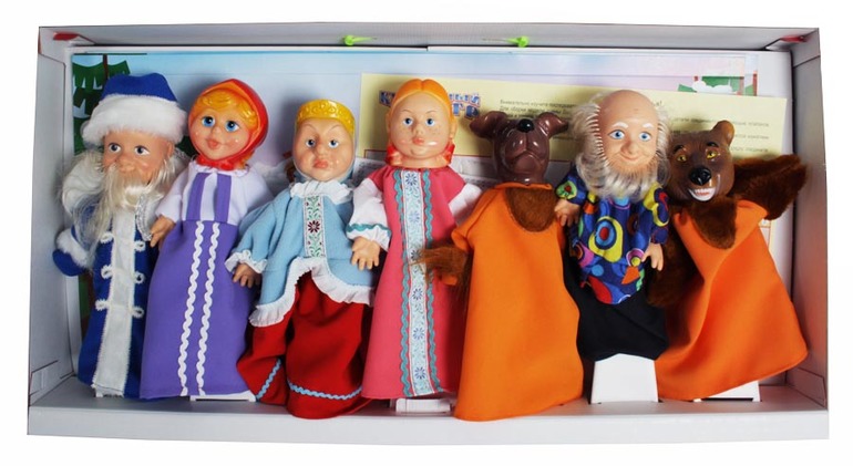 От одной бабушки одежка, от другой бабушки и тети - большой набор Кукольный театр от фабрики "Весна". С куклами, ширмой, сценарием и декорациями. Я как-то такие наборы стороной обходила, не нравилось мне качество, а тут взглянула и впечатлилась: очень красивые и реалистичные лица кукол, качественно сшитая одежда.
