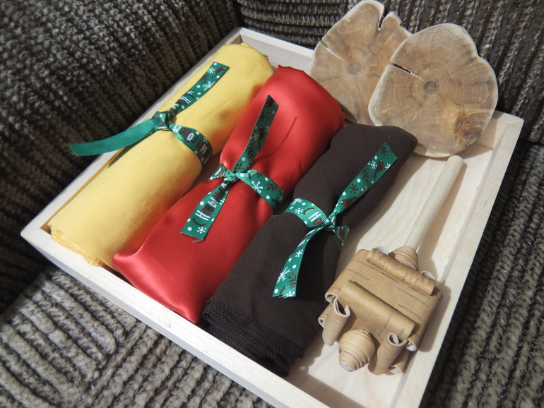 3 отреза натуральных тканей: желтый - хлопковый штапель, красный - шелковый атлас, коричневый - шелковый шифон. Шаркунок из бересты (это типа погремушки что-то), несколько спилов можжевельника (Любе нравится строить из деревяшек разные штуки).