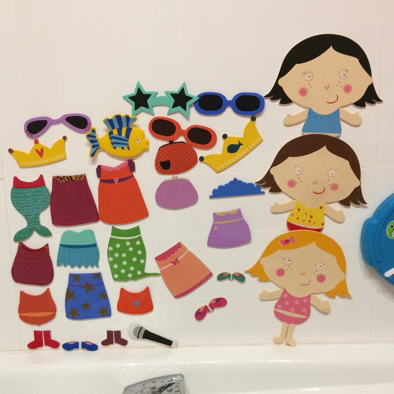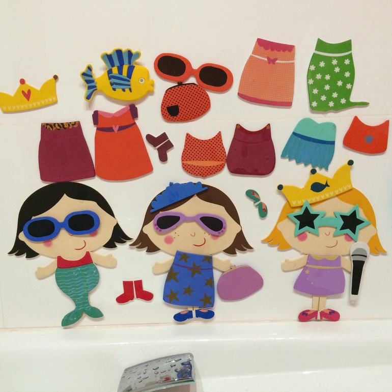 Итак, наш любимый набор "Модницы" от Lubby. Материал eva, нетоксичный, безопасный. В наборе 32!!! элемента, включая 3 кукол. Вариантов нарядить хватит не на один час купания))) Все детали очень яркие, краски не поблекли спустя 4 месяца ежедневного использования. Кроме того, в комплекте мешок-сетка для хранения на присосках, правда наши куколки так и остаются приклеенными к стене до следующего заплыва. Этот набор одно из лучших моих приобретений ребенку, и уж точно самый востребованный!
