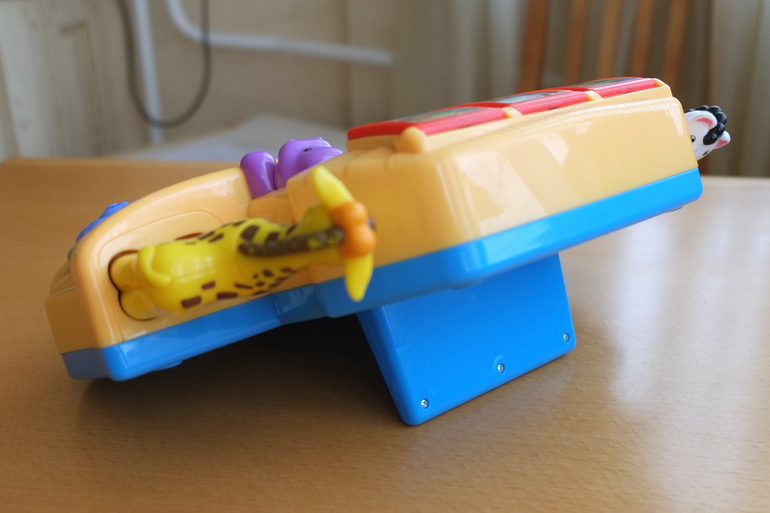 Резолюция: игрушка оказалась очень даже востребованной, даже при наличии немалого количества остальных, в том числе практически аналогов. Не знаю цену, но (кроме краски на жирафе) качество хорошее (хотя цветовая гамма не самая привлекательная). Работает, соответственно, от батареек.