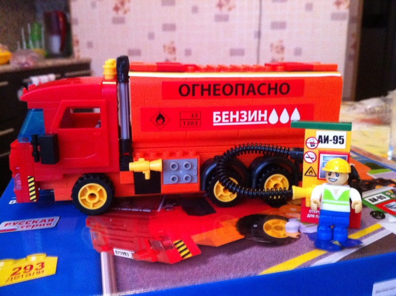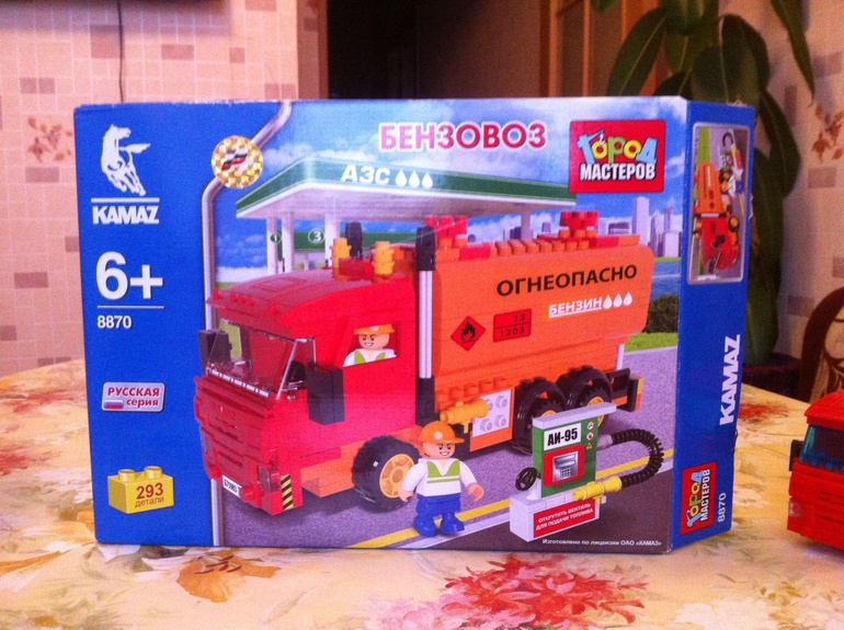 ИгрушкиБыли сегодня в детском мире, купила на пробу бензовоз от т.м. город мастеров за 899 р. Идет от 6 лет правда, но то, что было на 3 года ( а это был единственный самосвал) мне не понравилось, и я взяла бензовоз с расчетом что взрослые соберут а дети поиграют. Очень уж мне хотелось попробовать так ли он хорош, как говорят, ну и сравнить с любимым лего. Правда совместимость с лего не удалось проверить, т.к. у нас только лего дупло пока и мелких деталей нет, а этот конструктор от 6 лет и все детали мелкие. Итак, дети легли спать, мы с мужем открыли и давай собирать). Детали соединить тяжело, надо прилагать немалые усилия. По ходу сборки не досчитались нескольких деталей, хотя и остались другие, лишние. Колеса оказались кривые ( надеюсь видно на фото снизу), надо надклеить наклейки еще всякие ( чего нет в лего), и сверху крышки на цистерне, вобще не понятно на что расчитаны..., т.к. они не держаться и сразу отваливаются. Мы их сразу и убрали чтобы дети не съели. Для себя я сделала вывод, что лучше лего пока не нашла. Дальше фото: 3-е- кривые колеса, 4- лишние детали, 5-ое- наклейки, 7- крышки цистерны.