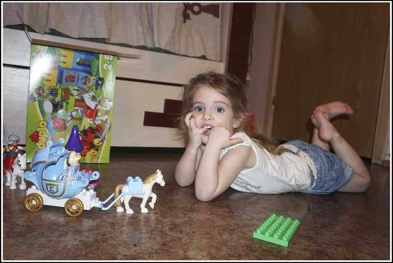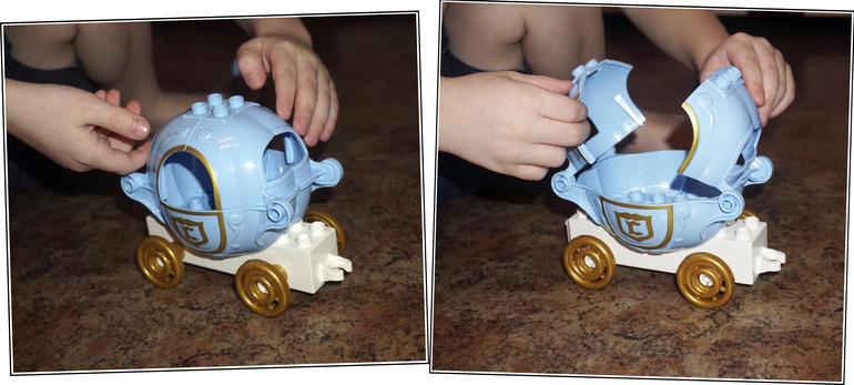 А вот в коллаж чуть выше затесалось фото чего-то розового. Это тоже новинка от Lego Duplo, девочковая серия Disney "Карета Золушки", ставшая первым девчачим наборчиком в нашей коллекции - так-то обычно Лера за милую душу рубится с братишками в их игры. А тут даже объяснять не пришлось, мальчишки сразу поняли, что розовое - это "не по-пацански" не для них, а Лера, наоборот, мгновенно просияла, прижав к груди коробочку и кокетливо защебетала: "А это что? А это кому? А это моя принцесса?"