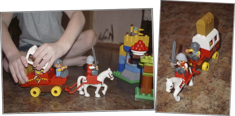 В нашем новом наборе (ныне, конечно, благополучно слившимся со всеми имеющимися детальками), как я уже говорила, есть рыцари, карета, башенка замка, яблоня с плодами (в качестве снарядов можно использовать), катапультой, сундук с сокровищами.