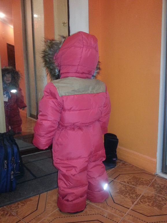 Почему-то мой телефон упорно пытается выдать сочный красный за малиново-розовый! Зараза! Комбез КРАСНОГО цвета, мех искуственный, но очень хороший, подворот сантиметров на 10-12 (размер 98-104, большемер). Я его затянула на талии (ну, чтоб совсем парень не провалился ;)), там кулиски.. И.. тадаааам!! Термометр!! Для измерения внутренней температуры комфорта ребенка. Я про такое слышала, но увидела в первый раз :). Прикольно!:) (Муж сразу предложил прикладывать комбез к голове - температуру измерять при болячках;)). Одежка очень теплая (заявка шла на 300 г утеплителя), внутри 50% синтепух и 50% пух-перо пополам. Нижние штанишки на резиночке (штрипок нет, возможно, придется пришить), внутренний рукавчик на трикотажном манжете. Подклад хлопок.