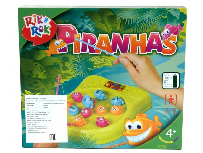 Подарили нам бабушка с дедушкой сие чудо, потому что внучка ооочень просила рыбалку )). Изначально искали магнитную рыбалку на рамке-вкладыше, не найдя ее купили "пираний". Игра рассчитана 2-3 человек, в комплекте магнитный прудик, 3 удочки разного цвета, 12 рыбок (по 4 рыбки каждого цвета), наклейки-глазки, наклейки-баллы (куда их лепить пока не разобрались). Возрастная категория 4+. Прудик с вращающимся внутри магнитиком, сами рыбки тоже имеют внутри магнит. Игра работает от одной батарейки (в комплект не входит) 1С. Игра хорошего качества, цвета яркие, но не навязчивые.